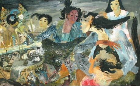 Lukisan ini mengingatkan karya Hendra lain berjudul Arjuna Menyusui Anaknya. Arjuna yang di atas panggung adalah seorang ksatria bagus, namun di belakang panggung badar menjadi seorang ibu yang tengah menyusui anaknya. Pada lukisan Bakul Wayang ini pun Hendra dengan jeli “memotret” dunia realitas keluarga anak komedi yang tengah rileks, beristirahat di sela hari-hari panjang pengembaraan mereka.